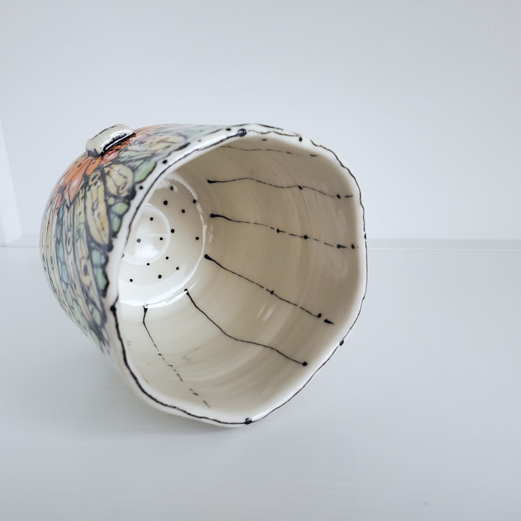 I love this mug so much! It has so much style: the painted flower detail is gorgeous and the hand (the way the cup fits in my hand and has a soft velvet feel to the glaze) it was delivered beautifully and happy with the new cup edition to my collection!