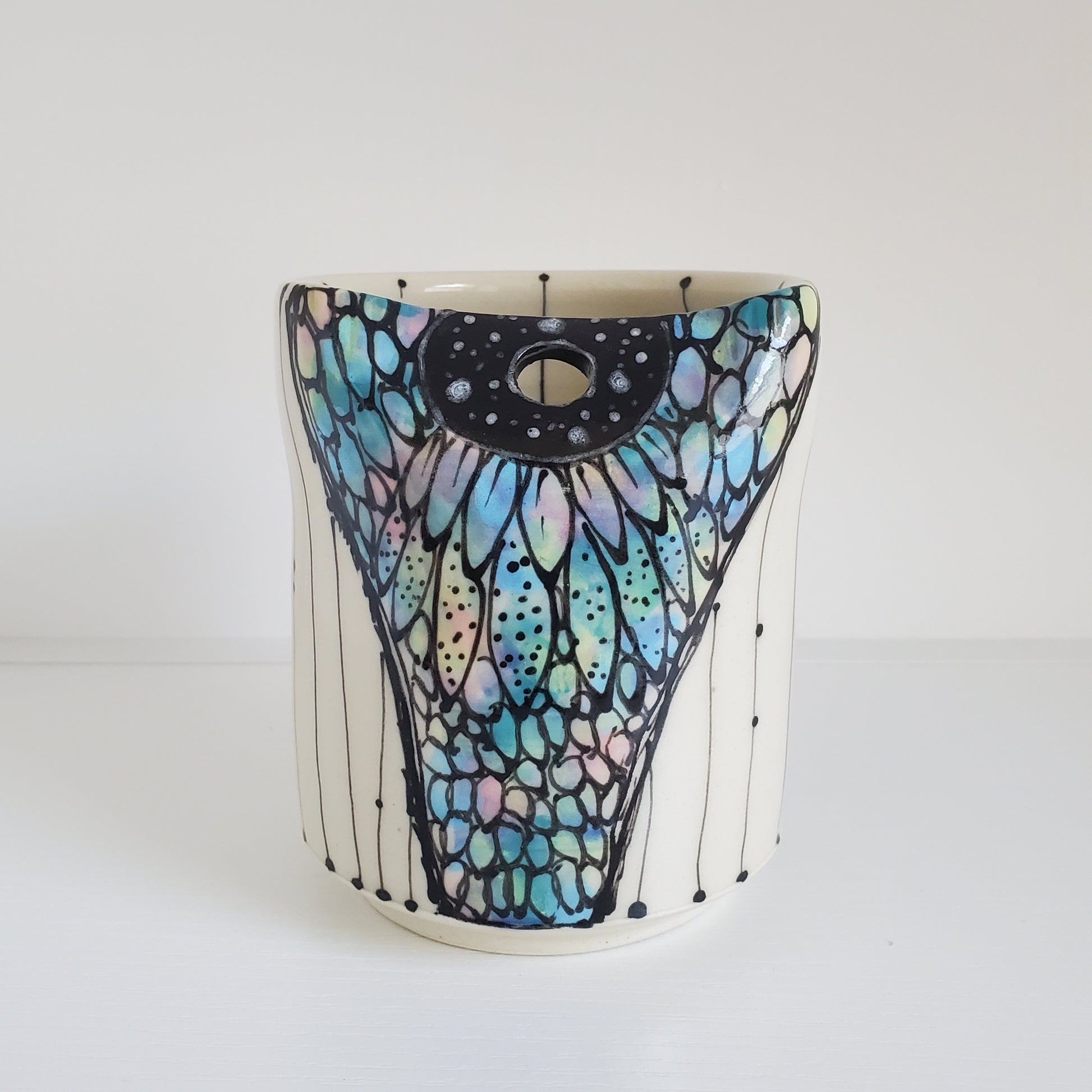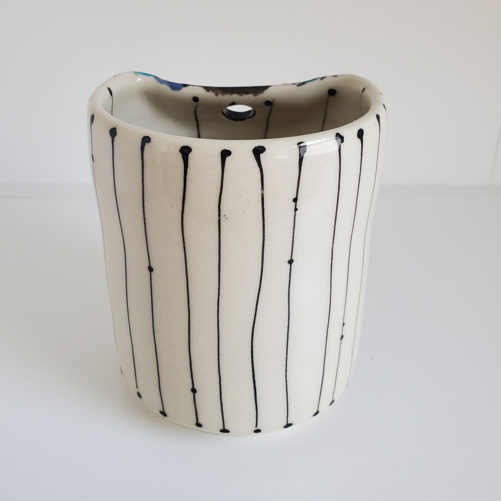 This handmade straw sip cup is designed to make every sip fun and effortless. The cheerful blue design adds a bright, uplifting touch, while the special straw hole allows you to drink from either side using the included metal straw. Hand-glazed and one-of-a-kind, this cup was created to bring a little joy to your everyday beverages.