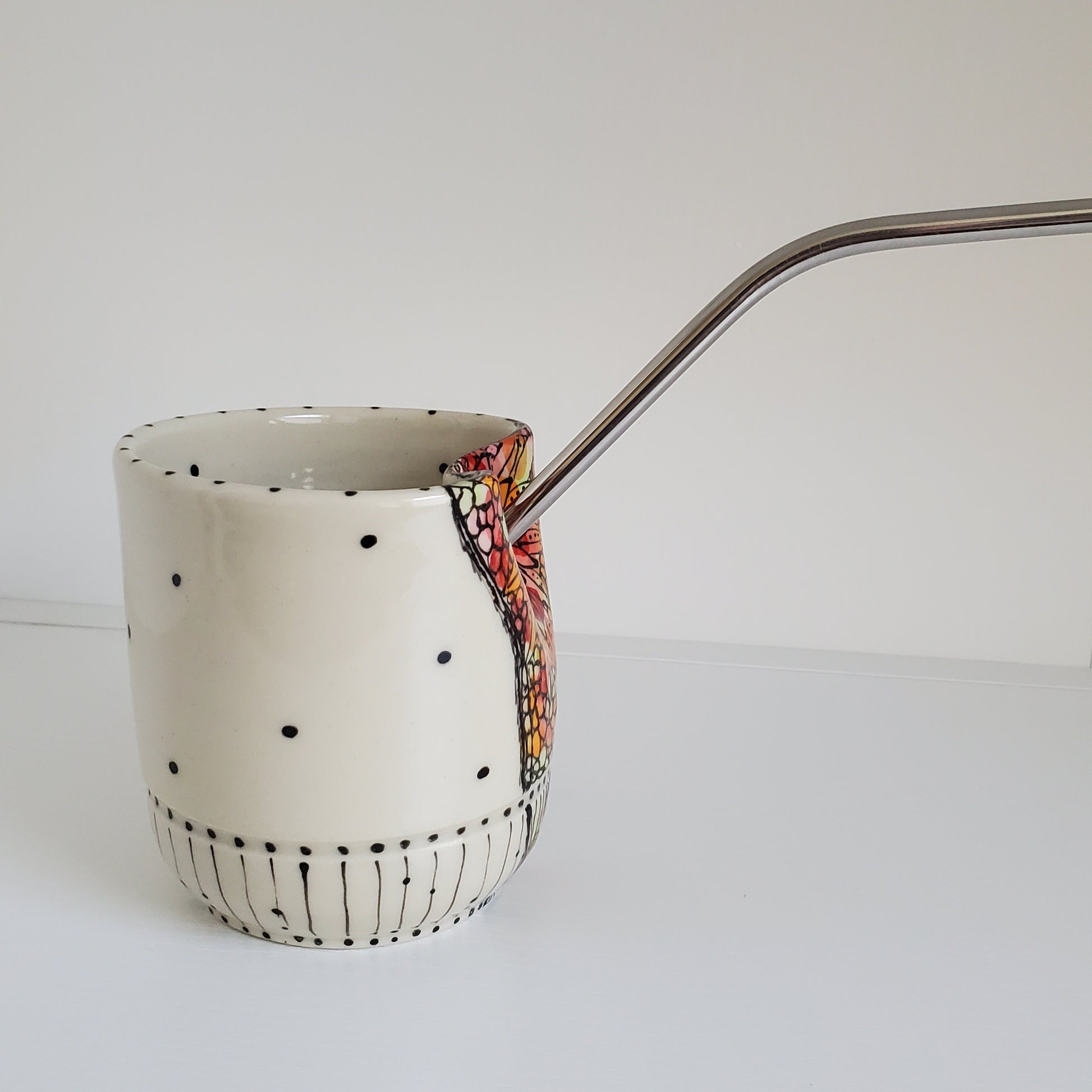 This handmade straw sip cup is designed for fun, easy sipping. The abstract red-orange bubble pattern adds a playful pop of color, while the cup’s clever design allows you to drink from either side using the included metal straw. Hand-glazed and one-of-a-kind, this cup makes every sip feel special, bringing a little joy to your day.