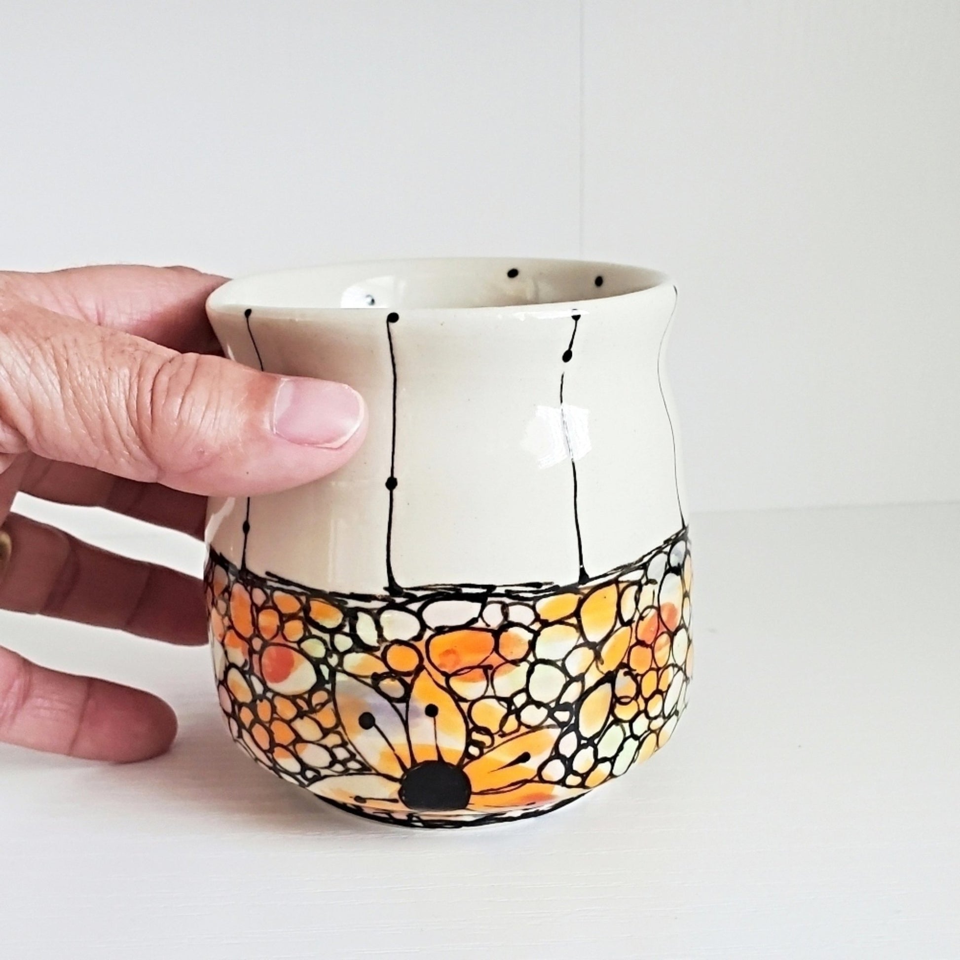 I love this mug so much! It has so much style: the painted flower detail is gorgeous and the hand (the way the cup fits in my hand and has a soft velvet feel to the glaze) it was delivered beautifully and happy with the new cup edition to my collection!