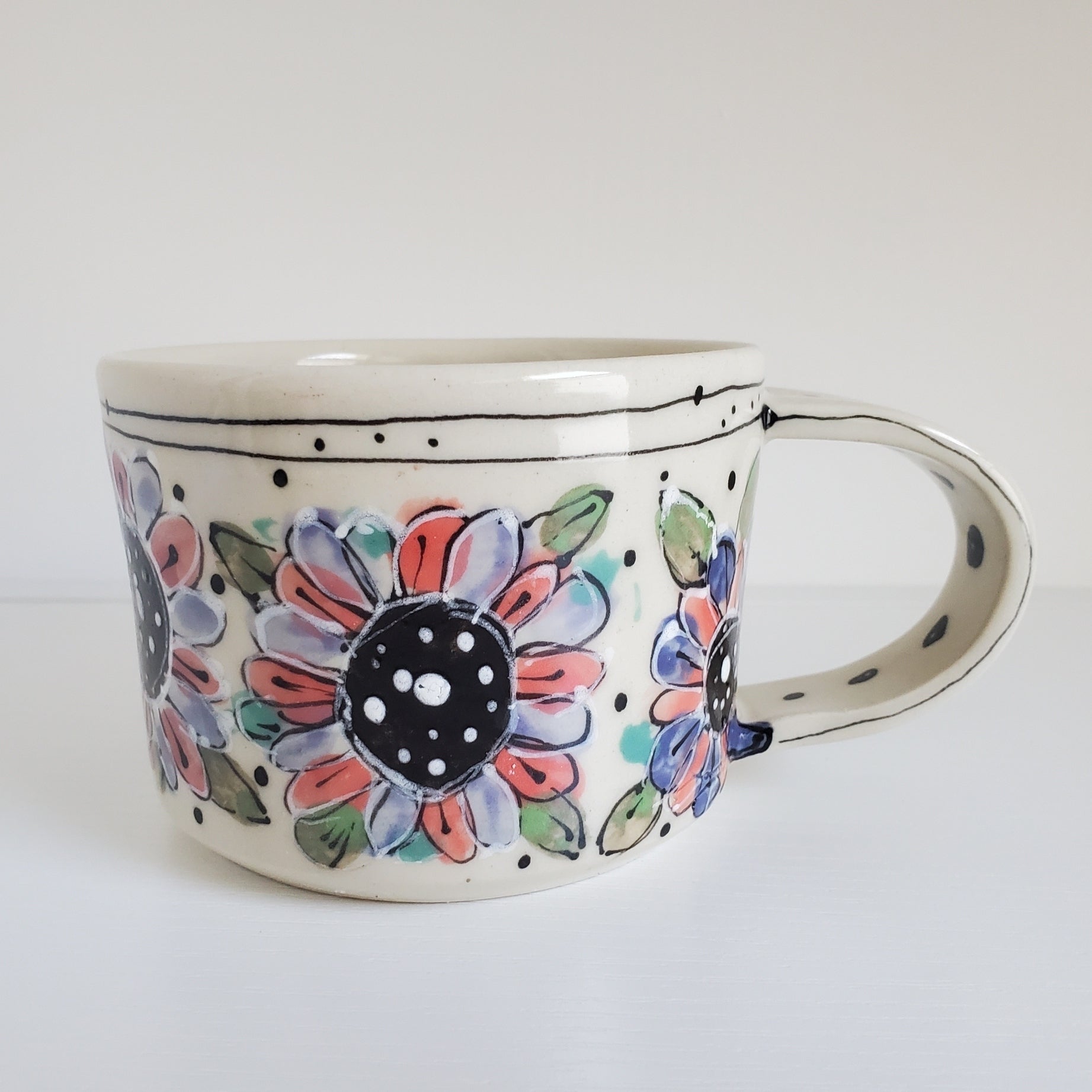 I love this mug so much! It has so much style: the painted flower detail is gorgeous and the hand (the way the cup fits in my hand and has a soft velvet feel to the glaze) it was delivered beautifully and happy with the new cup edition to my collection!