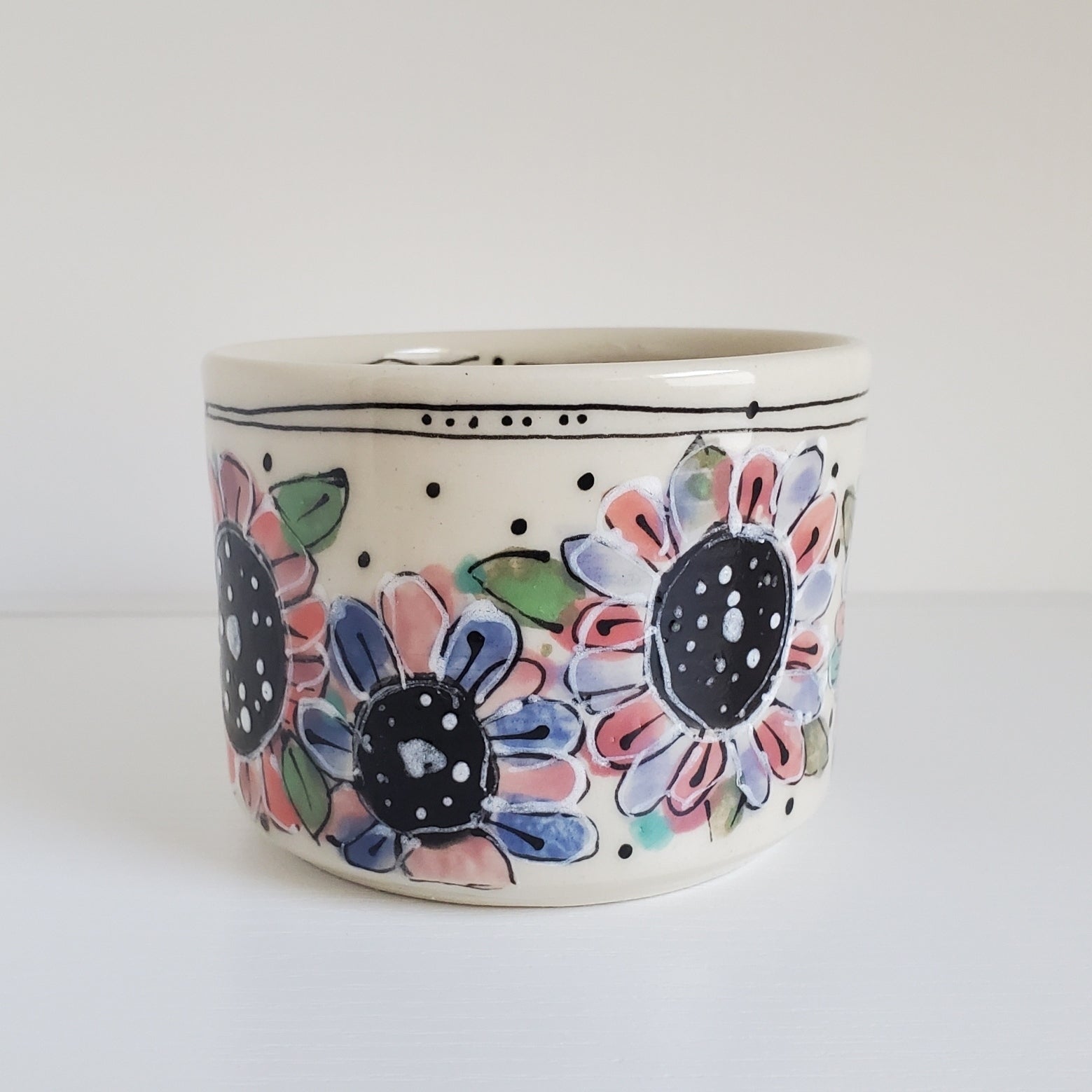 This handmade flower mug is a cheerful reminder to let your light shine—bright, playful, and unique—so it can bring warmth, hope, and joy to those around you. Hand-glazed pink and periwinkle flowers dance across the mug, making it as one-of-a-kind and uplifting as the light within you, created to be shared.