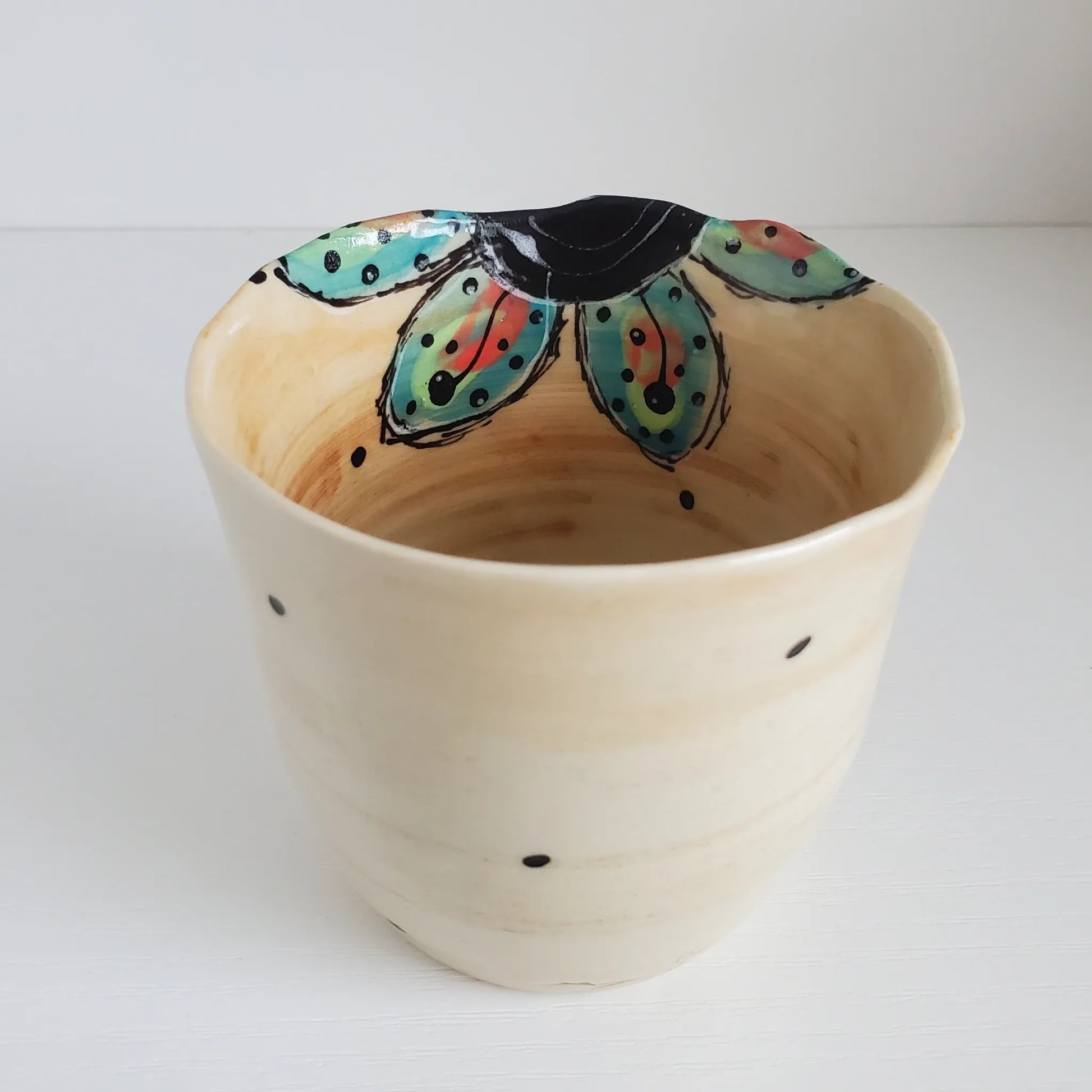 I love this mug so much! It has so much style: the painted flower detail is gorgeous and the hand (the way the cup fits in my hand and has a soft velvet feel to the glaze) it was delivered beautifully and happy with the new cup edition to my collection!