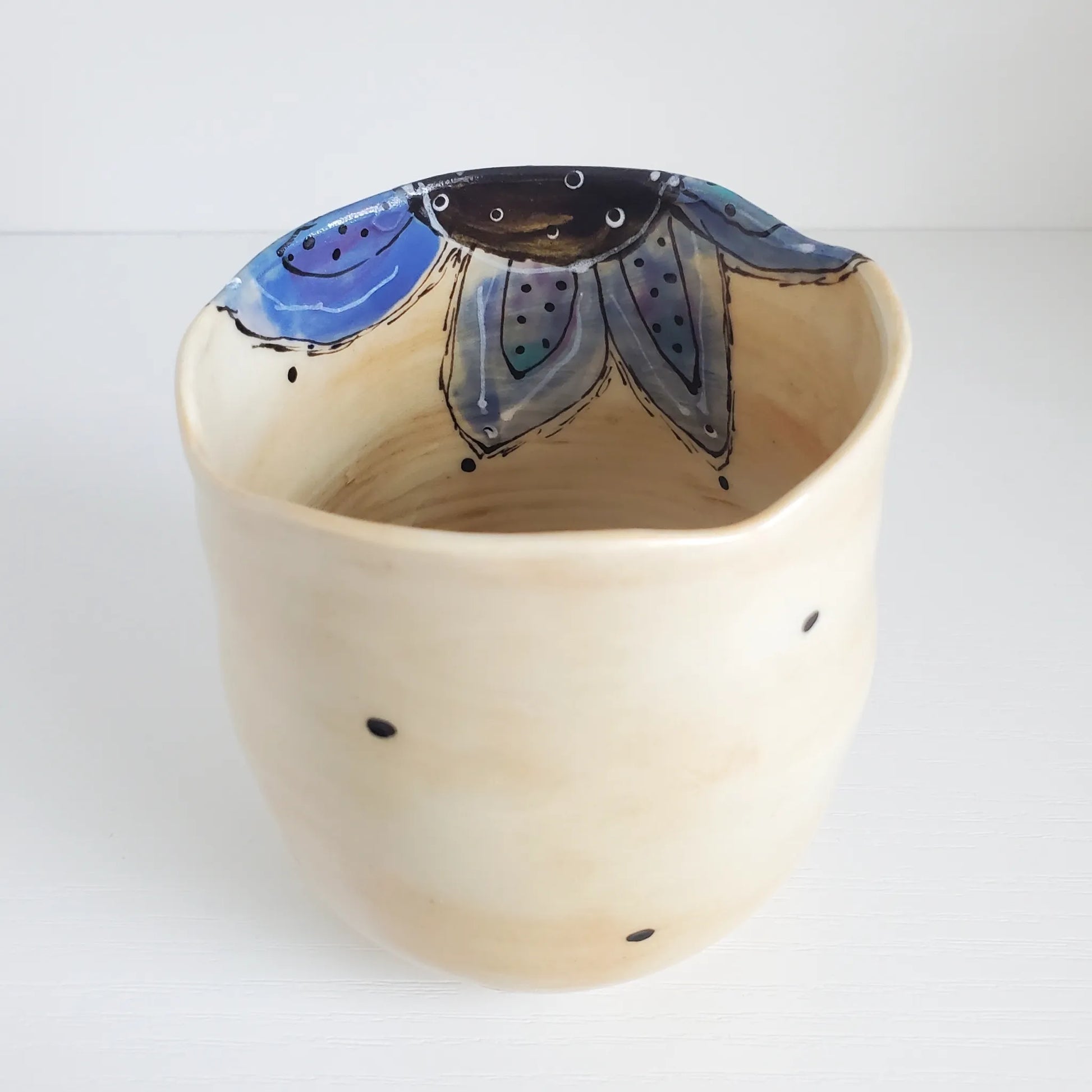 I love this mug so much! It has so much style: the painted flower detail is gorgeous and the hand (the way the cup fits in my hand and has a soft velvet feel to the glaze) it was delivered beautifully and happy with the new cup edition to my collection!